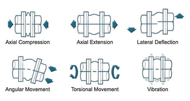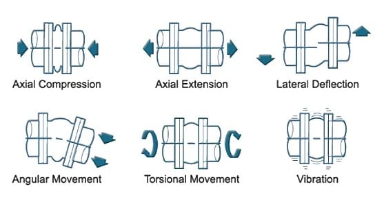 Hareketler: Kauçuk ve metal kompansatörler eksenel düzlemde (Sıkıştırma ve uzatma) benzer hareket yeteneklerine sahiptir. Ancak kauçuk bağlantı noktaları, benzer yüz yüze uzunluklara sahip metal bağlantı noktalarıyla karşılaştırıldığında kesinlikle daha büyük yanal hareketleri absorbe edebilir.